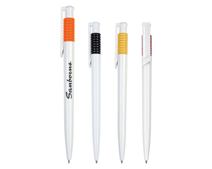 bolígrafo de plástico, cuerpo blanco, detalle de anillo en color. mecanismo de click.
