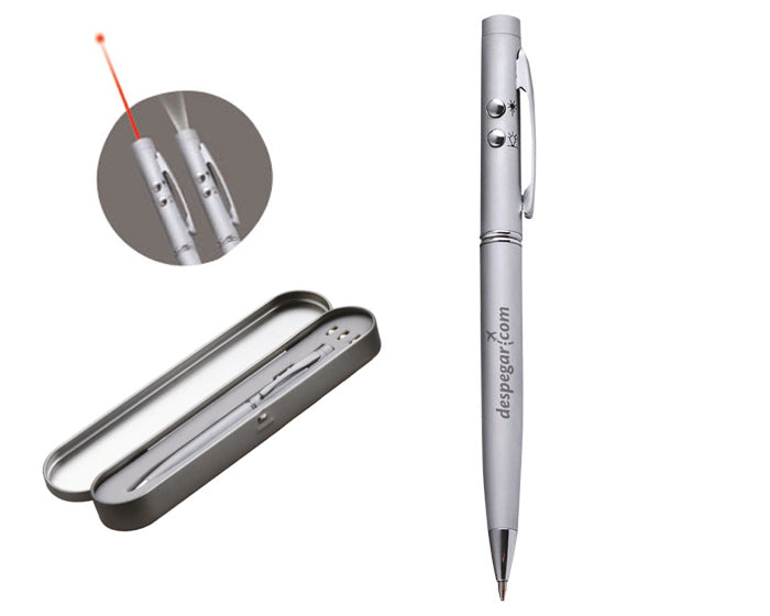 bolígrafo metálico con luz y señalador láser, ideal para presentaciones. presentación: estuche de aluminio en color plata. incluye 3 pilas en uso y 3 pilas de repuesto.