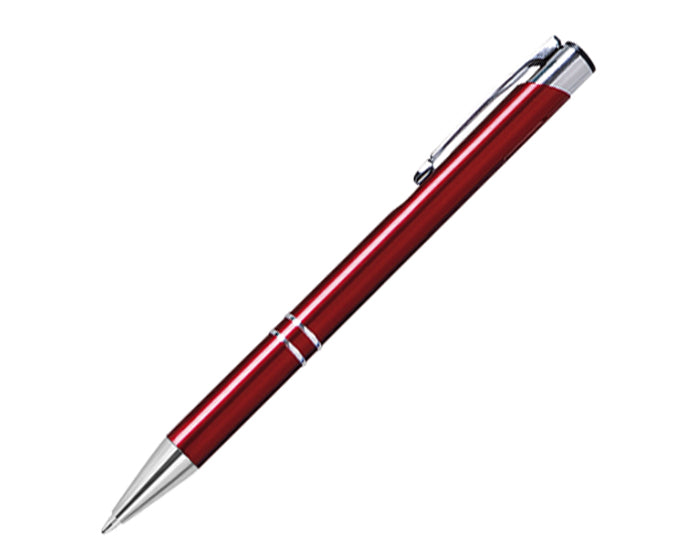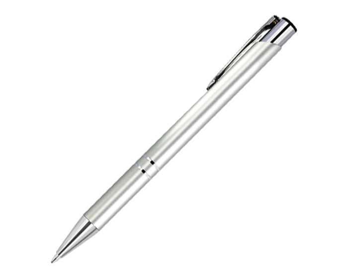 bolígrafo de aluminio de tinta azul, con clip, punta y detalles en cromo. mecanismo de click.