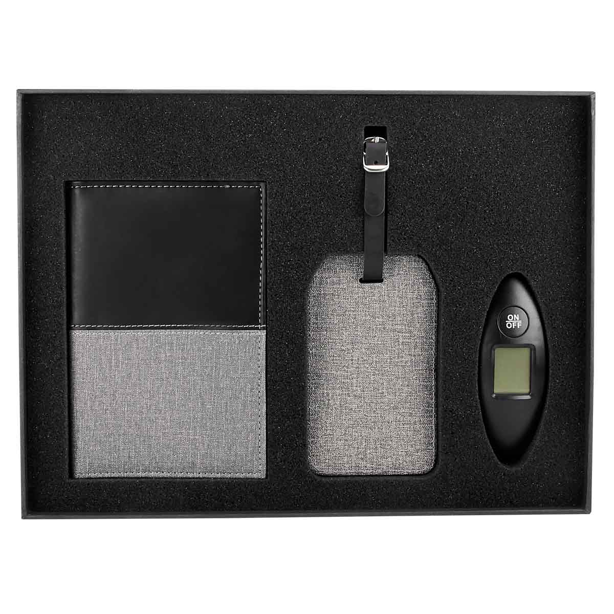 incluye porta pasaporte, identificador de maleta con papel para datos y báscula con display digital con capacidad máxima de 40 kg (unidades de peso: kg y lb) y caja de regalo.