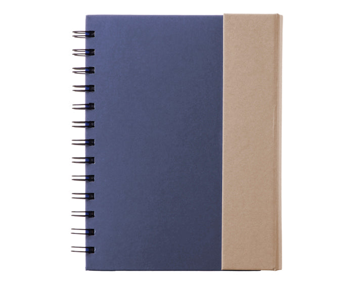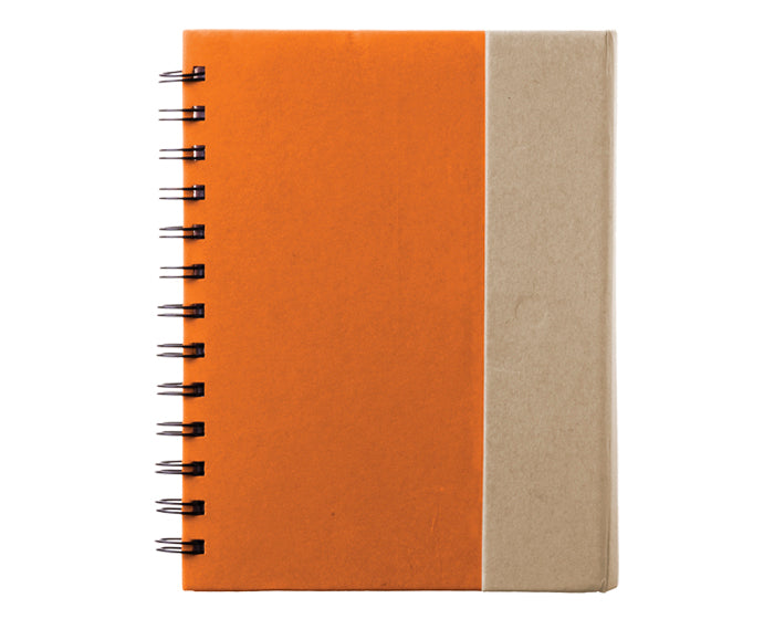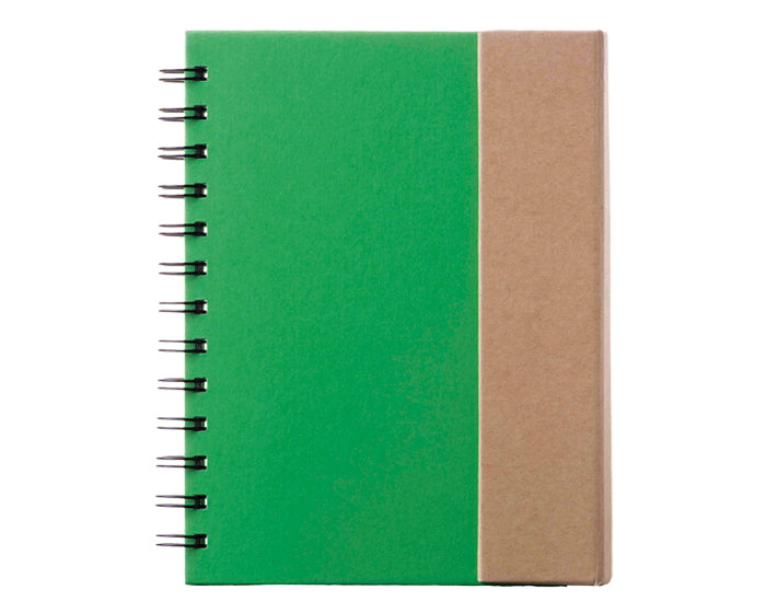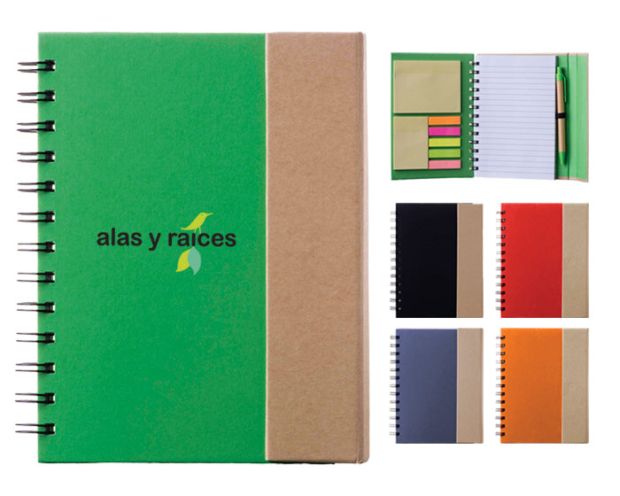 libreta ecológica con espiral metálico, broche magnético y protector de externos. incluye 5 bandas adhesivas en colores diferentes y blocks de notas rectangulares en 2 tamaños. 70 hojas rayadas (140 páginas) y bolígrafo de papel con sujetador elástico.