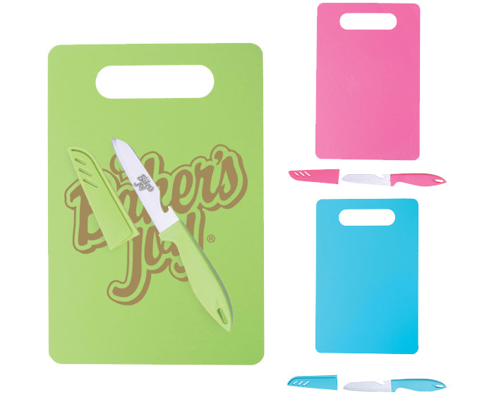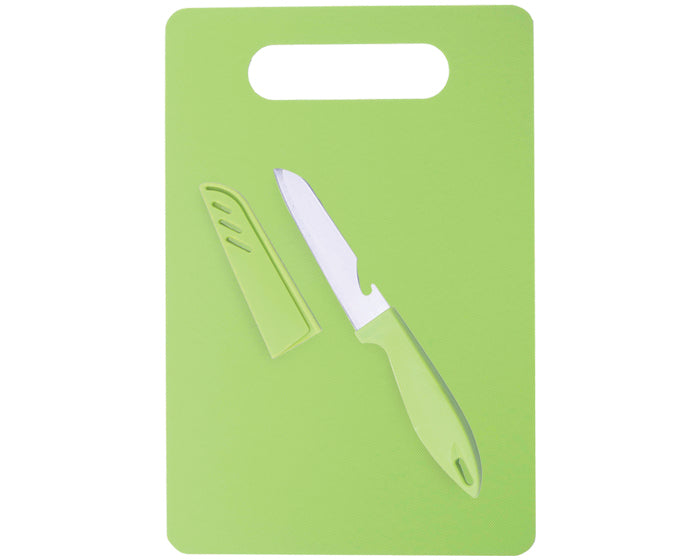tabla para picar y cuchillo de cocina con destapador. el cuchillo cuenta con mango de plástico y funda protectora del mismo color, útil para conservarlo en buen estado y evitar accidentes en la cocina.