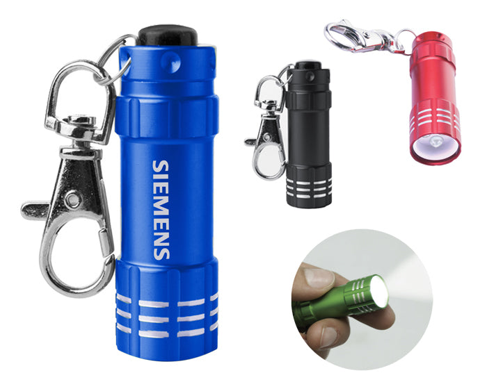 llavero metálico con linterna, luz blanca de 3 leds de alta intensidad, botón de encendido con goma de protección. incluye baterías. presentación: caja en color negro.