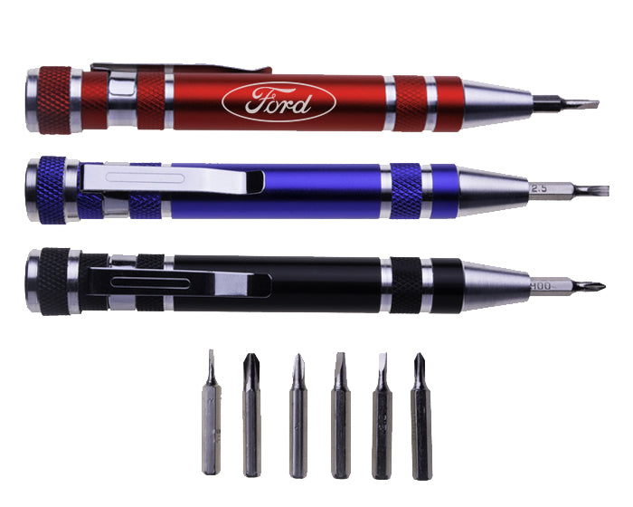 desarmador tipo pluma metálica en tres colores. incluye 8 diferentes puntas, las cuales se guardan en el cuerpo del desarmador. presentación: caja en color negro.