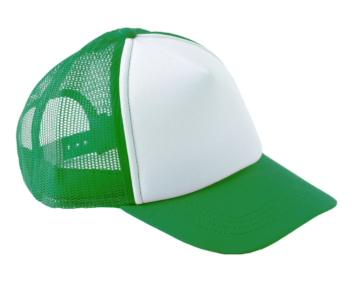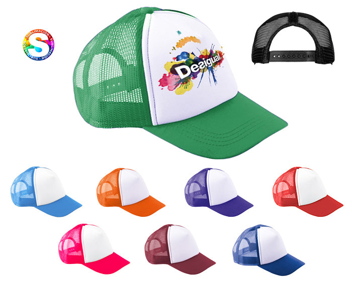gorra en poliéster con visera de algodón. con frente acolchado y 4 gajos en malla. ajuste con broche de plástico.