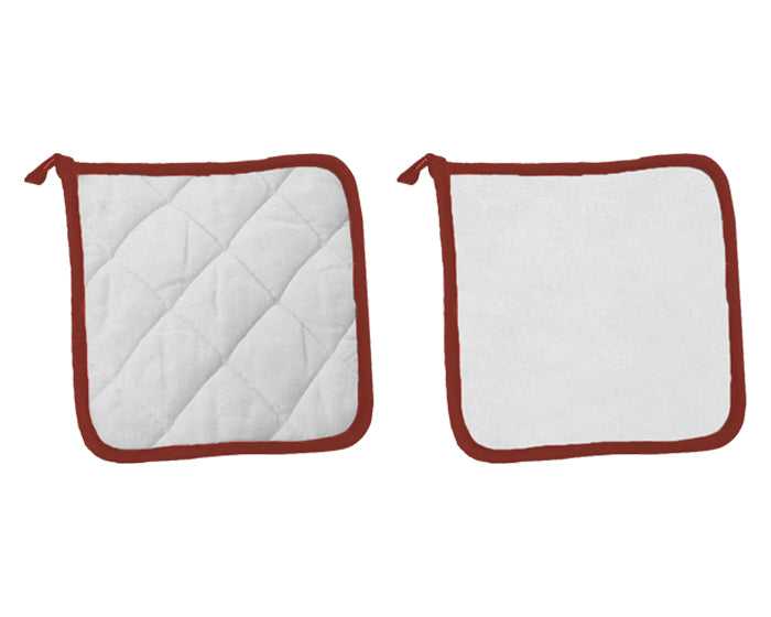 sujetador de utensilios calientes, de tela tipo “manta” con detalles al filo y presilla para colgar.