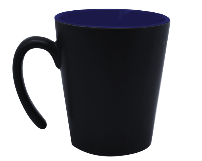 tarro de cerámica con forma cónica y asa volada, acabado exterior mate e interior de color brillante cap. 12 oz. venta en múltiplos de 12.