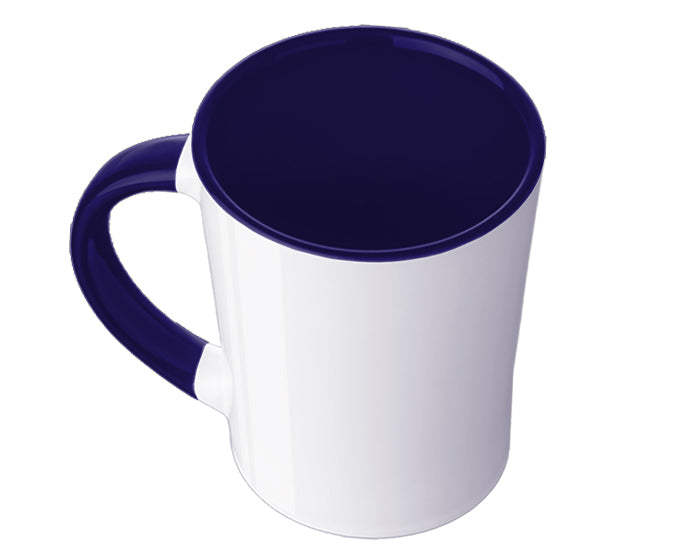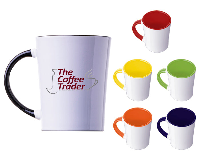 tarro de cerámica bicolor, forma cónica, con asa en combinación, con color interior brillante, acabado liso vitrificado. cap. 14 oz. venta en múltiplos de 12.