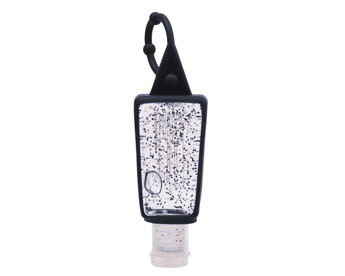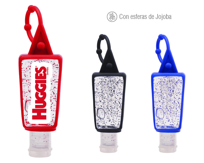 gel antibacterial en envase de plástico y funda portátil en silicón. su fórmula contiene esferas de jojoba que proporcionan humectación y suavidad. se puede colocar una etiqueta adherible en el envase. cont. 30 ml.