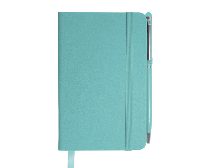 mini libreta de pasta rígida de color, tamaño a6. cuenta con banda elástica para cierre y listón separador, 80 hojas beige rayadas (160 páginas). incluye bolígrafo metálico en color a combinacion. el bolígrafo tiene detalles en color plata y cuenta con touch para dispositivos táctiles.