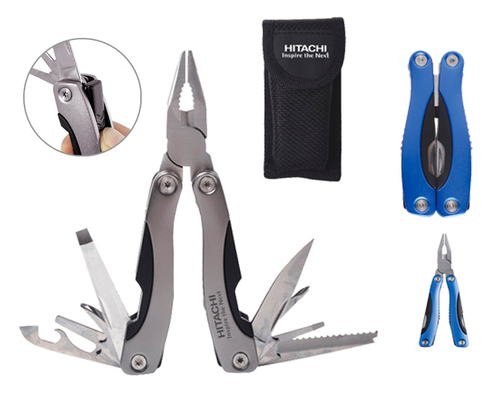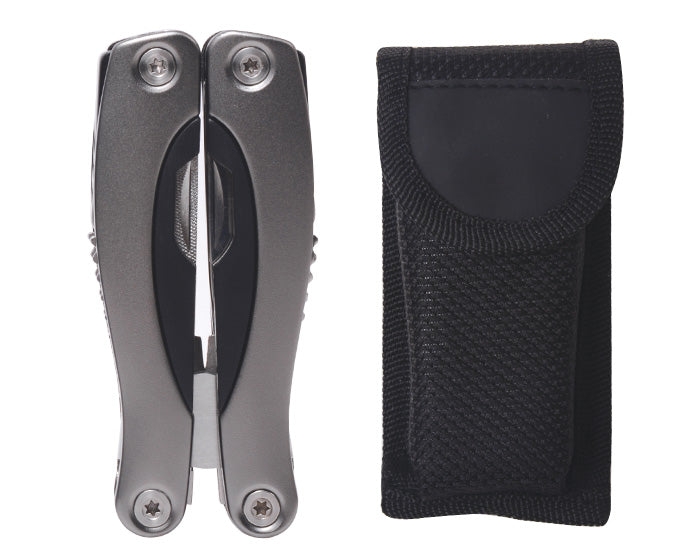 herramienta plegable con 9 funciones: pinzas de punta, navaja, dos desarmadores planos y un desarmador de cruz, sierra, destapador doble, abrelatas y lima. con superficie antideslizante para mejor manipulación. cuenta con seguro de bloqueo para fijar cada herramienta. incluye estuche. presentación: caja en color negro.