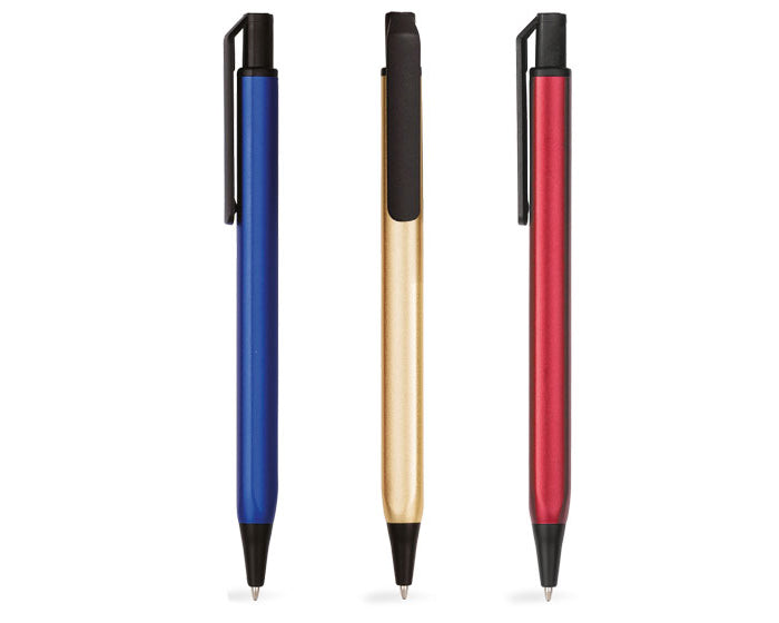 bolígrafo metálico brillante, punta y clip de plástico en color negro. diseño ergonómico de cuerpo triangular. mecanismo de click.