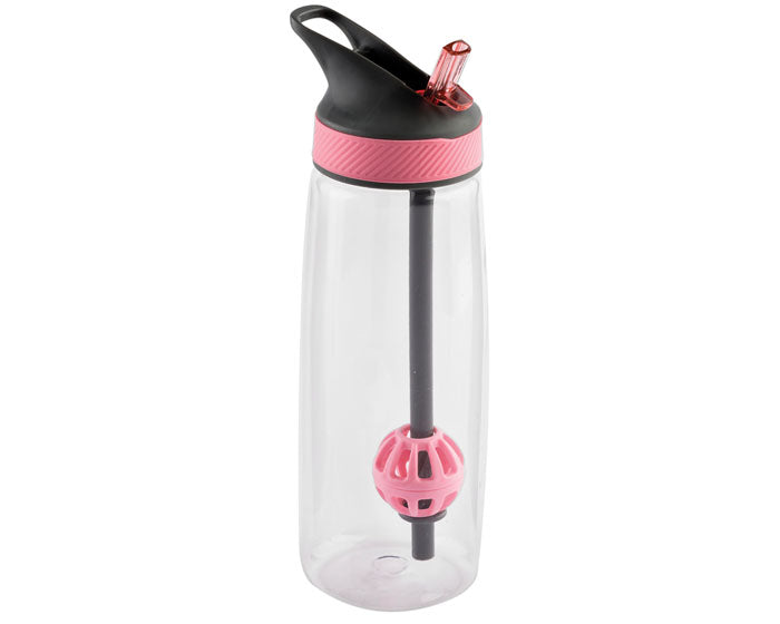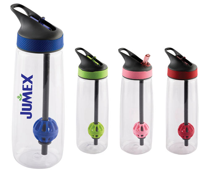 cilindro transparente con tapa de rosca, banda de silicón en color, asa y boquilla plegable. cuenta además con popote rígido, seguro y mezclador esférico de plástico para preparar batidos de forma rápida y sencilla. cap. 800 ml. *bpa free.