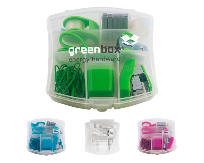 set de escritorio que incluye clips para papel, sacapuntas, mini engrapadora, grapas, saca grapas, tijeras, mini despachador de cinta adhesiva y cinta de repuesto. presentación: estuche de plástico transparente.