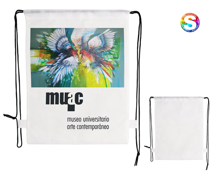 morral ecológico de non woven para sublimar, con jareta y cordón negro. temperatura y tiempo sugeridos para sublimar: 190 grados / 60 seg.