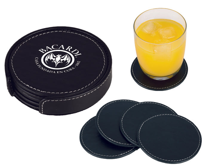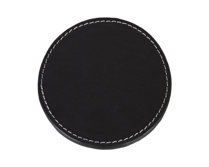 juego de 4 portavasos redondos de curpiel con detalle de costura en hilo blanco. incluye base del mismo material. presentación: caja en color blanco.