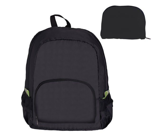 mochila plegable con compartimento exterior y bolsillos laterales de malla. se puede compactar por medio de su bolsa externa, que cuenta con cierre doble vista y en la cual se pliega toda la mochila. cuenta con correas ajustables y asa superior de transporte.