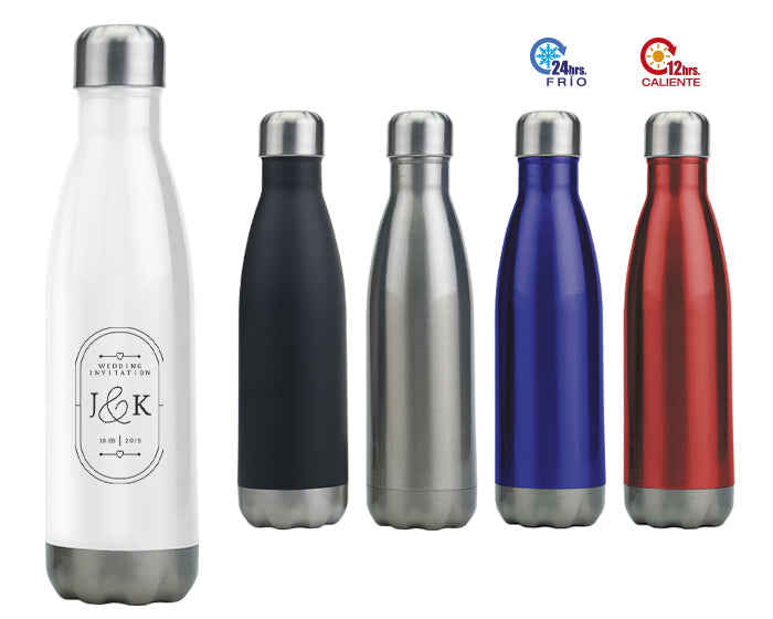 termo de acero inoxidable en forma de botella, cuenta con doble pared insulada al vacío y capa interior de cobre, conserva el frío por 24 hrs. y el calor por 12 hrs. tiene tapa de rosca hermética anti derrames. cap. 480 ml. presentación: caja en color blanco.