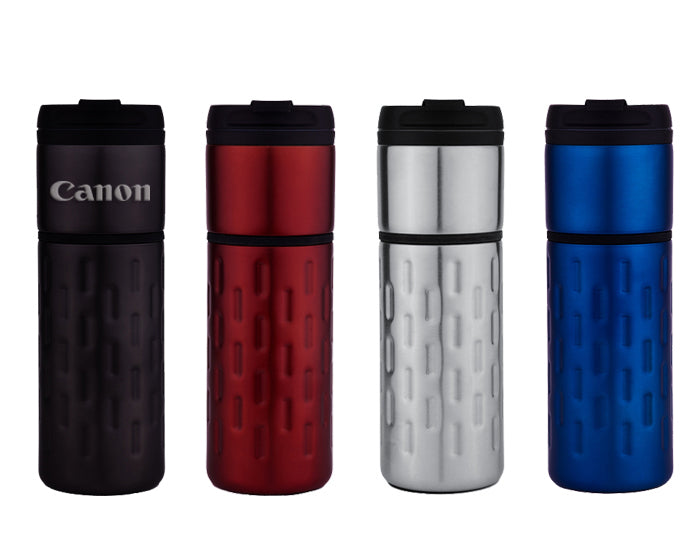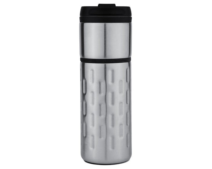 termo metálico de acero inoxidable con interior de plástico. tapa de rosca hermética abatible con boquilla y hendidura, para beber cómodamente los líquidos sin que se derramen. cintillo intermedio de silicón. cuerpo diseñado con finos detalles en relieve que le dan un toque elegante y de presencia. cap. 470 ml. presentación: caja en color blanco.