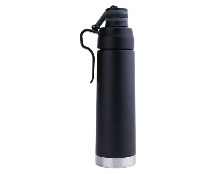 termo de acero inoxidable con acabado mate y practica asa metálica para sujetarlo fácilmente o para colgar en la mochila. cuenta con boquilla para tomar cómodamente las bebidas y con tapa de rosca amplia para vaciar líquidos fácilmente. el diseño tiene detalles decorativos con banda y correa de silicón en color. cap. 540 ml. presentación: caja en color blanco.
