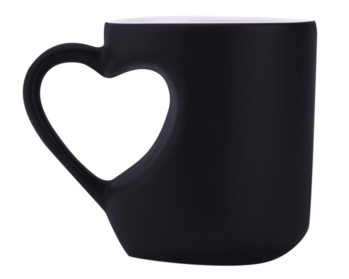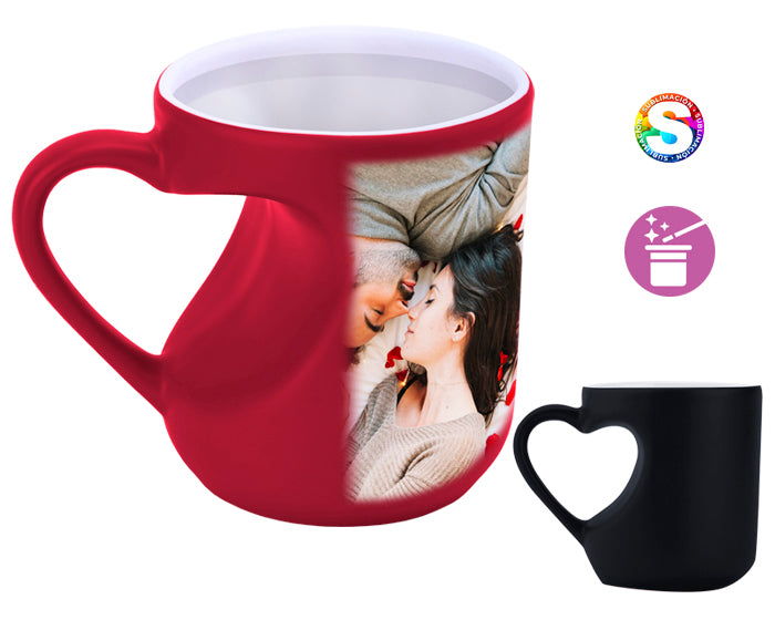 taza mágica de sublimación con asa en forma de corazón. el diseño aparece al servir agua caliente. cap. 300 ml. (10 oz). temperatura y tiempo sugeridos para sublimar: 190 grados / 120 seg. venta en múltiplos de 12.