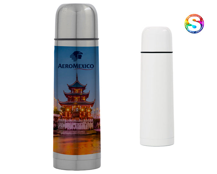 termo para sublimación de acero inoxidable de doble pared, insulado al alto vacío. cuenta con tapa de rosca amplia para vaciar líquidos con boquilla a presión para beber y tapa exterior. cap. 470 ml. (16 oz). presentación: caja individual.