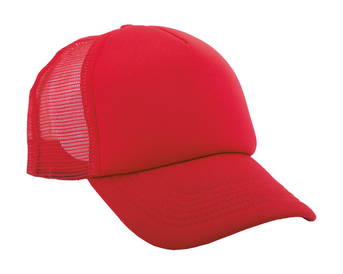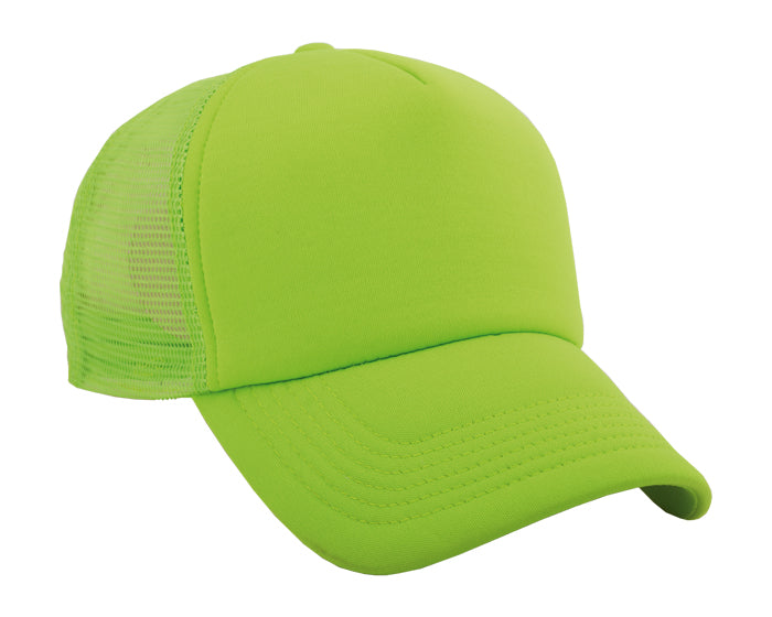 gorra de poliéster con cuerpo y visera del mismo color. con amplio frente acolchado y 4 gajos en malla en color fosforescente. ajuste con broche de plástico.