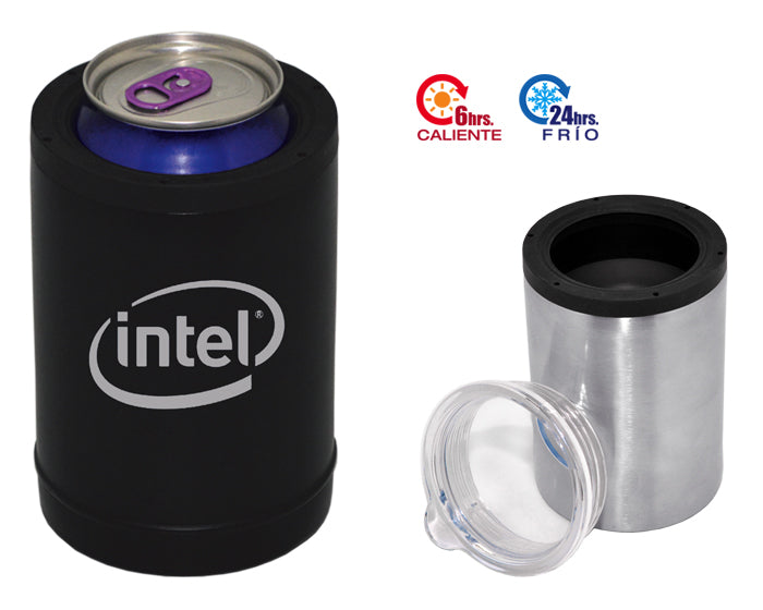 termo y porta lata de acero inoxidable 304, con doble pared insulada al alto vacío para preservación de frío por 24 hrs. y calor por 6 hrs. por medio de la tapa de rosca tipo anillo en negro, se puede sujetar la lata, para evitar que se resbale. para bebidas calientes, cuenta con una segunda tapa de rosca color transparente. cap. 360 ml. presentación: caja en color blanco.