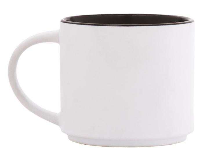 taza de cerámica bicolor apilable, con exterior blanco mate e interior en color brillante. cap. 15 oz. venta en múltiplos de 12.