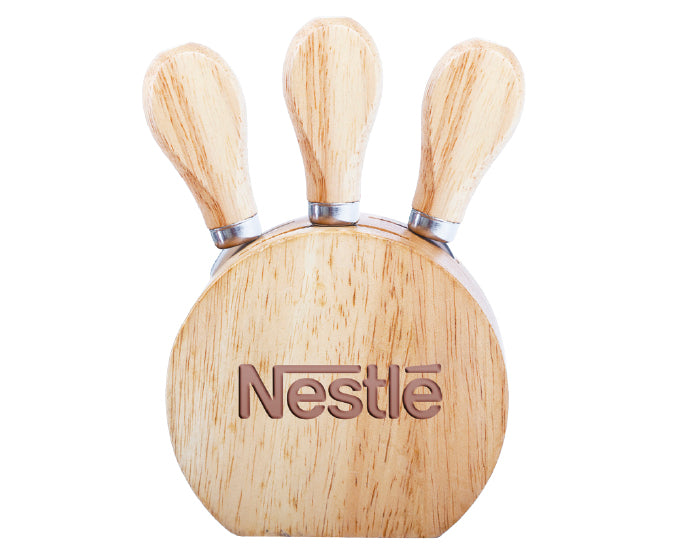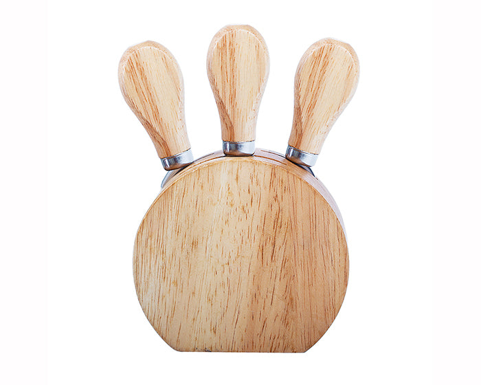 juego de utensilios para cortar queso o carnes frías con mango y base de madera. incluye: cuchillo, espátula y tenedor de acero inoxidable. presentación: caja en color blanco.