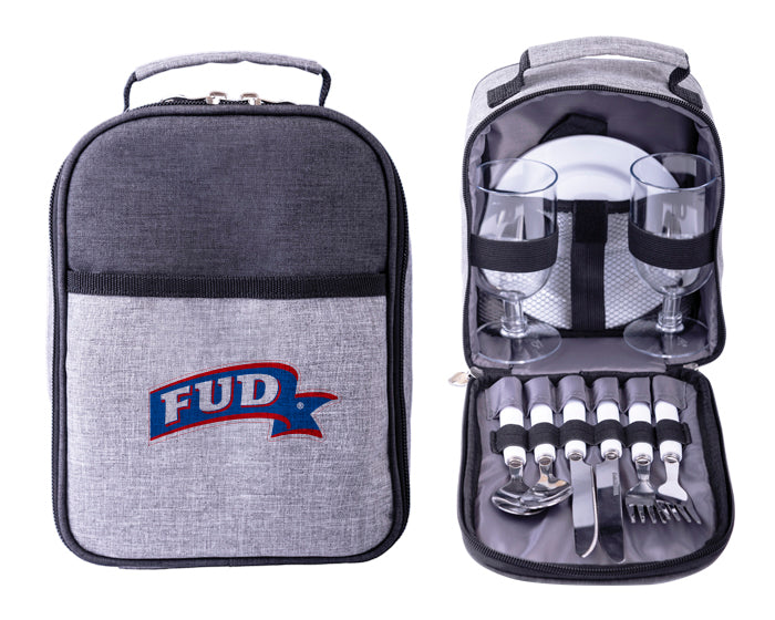 set portátil de utensilios para dos personas. incluye: 2 platos de melamina, 2 tenedores, 2 cucharas, 2 cuchillos, 2 copas y estuche de poliéster.