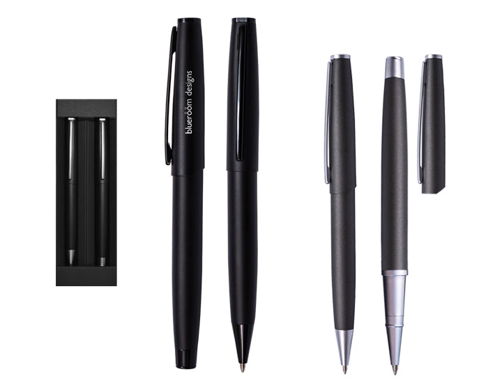 set de bolígrafos metálicos. un bolígrafo de punto fino tipo roller con tapa y otro bolígrafo con mecanismo retráctil con clip metálico. presentación: caja en color negro.