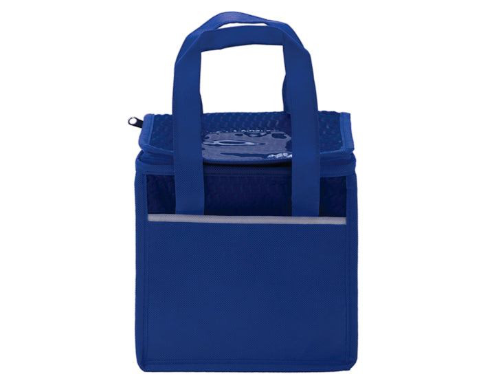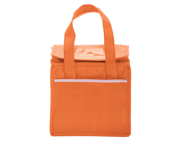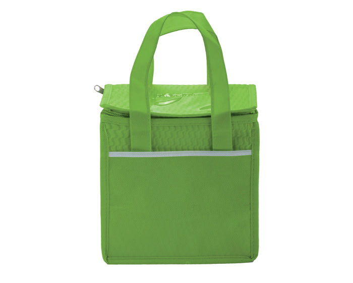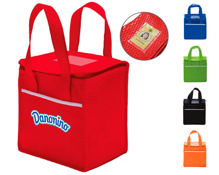 lonchera ecológica con interior térmico cosido, exterior texturizado, compartimento frontal, porta credencial en la parte superior y asas para transportar.