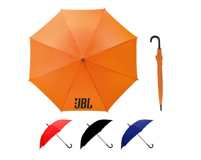 paraguas antiviento con botón de apertura automático, varillas de fibra de vidrio, eje de metal y mango de plástico. 8 gajos.