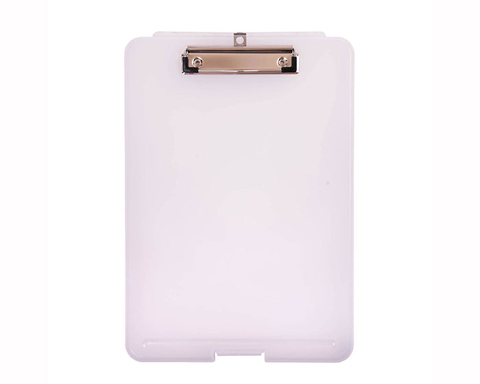 porta documentos de plástico traslúcido con clip exterior metálico para sujetar hojas.