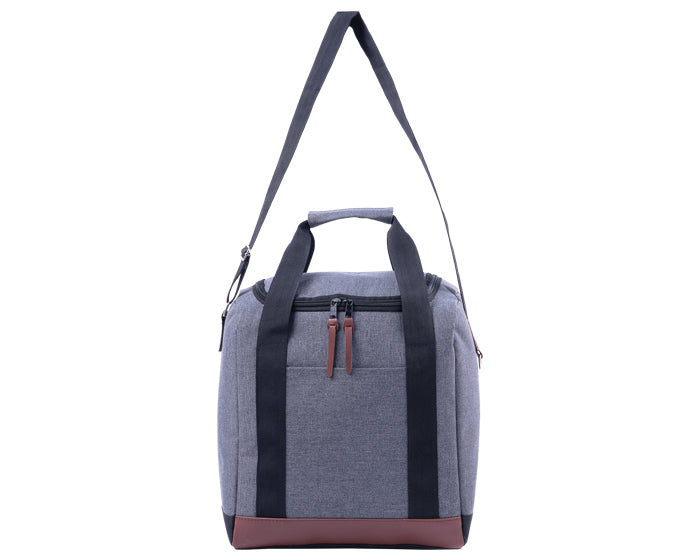 lonchera / hielera con cubierta e interior cosido en plástico anti escurrimiento, cuenta con un compartimento frontal, 2 cierres, argolla metalica lateral para colgar accesorios, correa ajustable y asas para transportar.