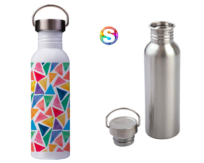 cilindro de acero inoxidable para sublimación, con tapa de rosca y asa. cap. 600 ml. (20 oz). presentación: caja individual. temperatura y tiempo sugeridos para sublimar: 195 grados / 45 seg.