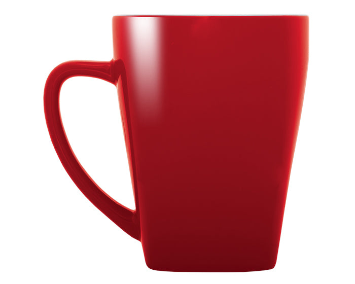 taza con base cuadrada y borde superior redondo, exterior a color semi mate e interior blanco brillante. cap. 12 oz. venta en múltiplos de 12.