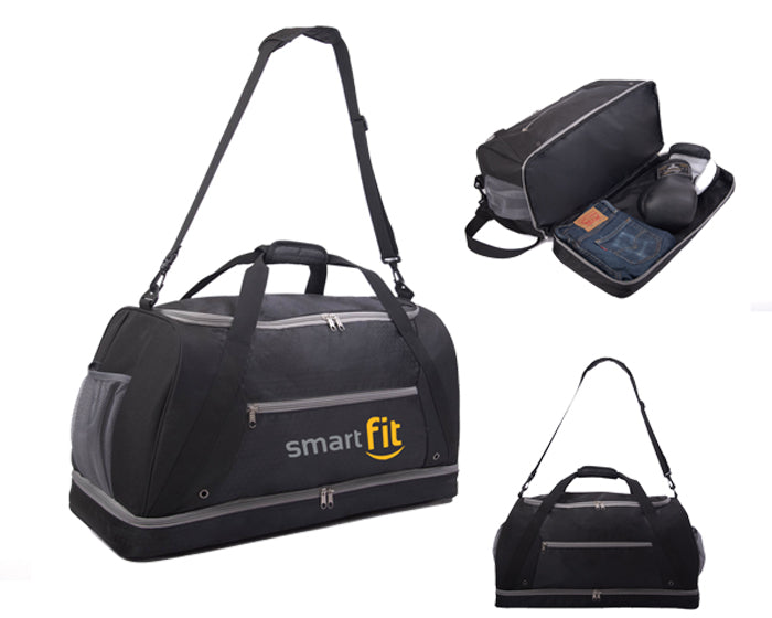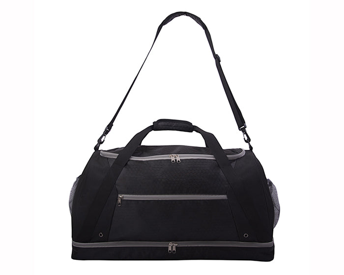 maleta deportiva, con 2 compartimentos, uno para guardar tenis o toalla y el segundo para objetos de viaje como ropa. cuenta con 2 bolsas laterales de malla, asa central ajustable y asas laterales.