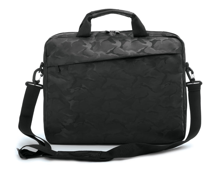 maletín porta laptop de 15.6 pulgadas con 2 compartimentos con diseño de camuflaje. interior acolchado con compartimento para accesorios. correa larga ajustable y asas. banda para sujetarse sobre maleta de viaje.