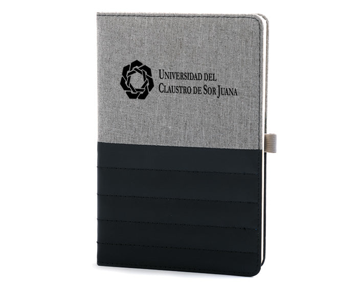 libreta vertical a5 de pasta rígida con cubierta tipo curpiel. de 80 hojas rayadas (160 paginas). separador de listón y porta bolígrafo elástico.