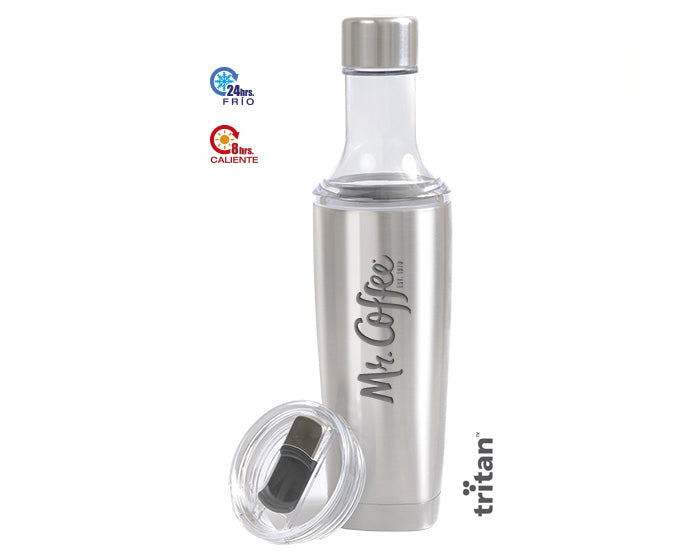 termo 2 en 1 de doble pared de acero inoxidable insulado al alto vacío, mantiene las bebidas frías por 24 hrs. y calientes al menos por 8 hrs. cuenta con 2 tapas de rosca de tritan, una con apertura deslizante para usar como termo y otra con forma de botella para transportar. cap. 660 ml. presentación: caja en color blanco.