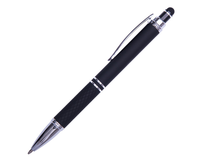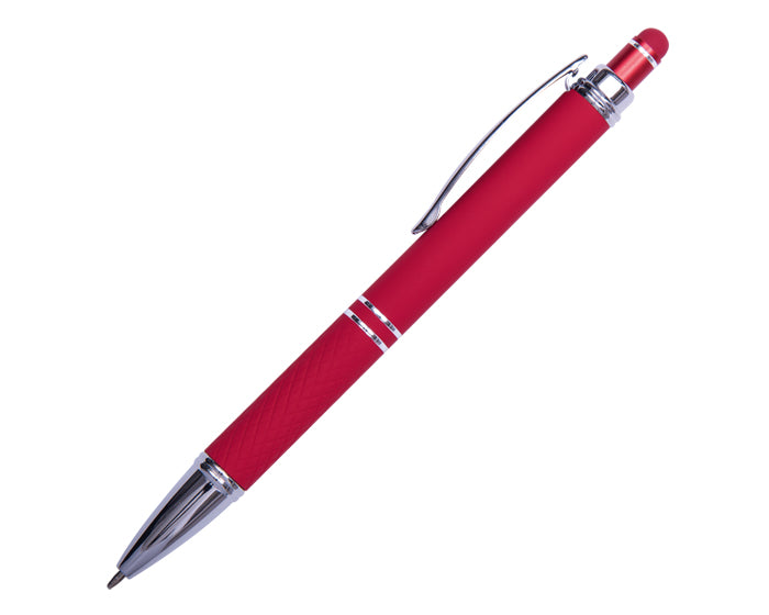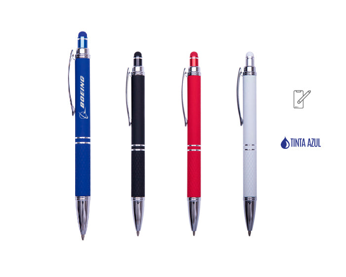 bolígrafo de aluminio de tinta azul, con recubrimiento de goma, parte inferior con textura. detalles y clip metálico. punta touch y mecanismo de click.