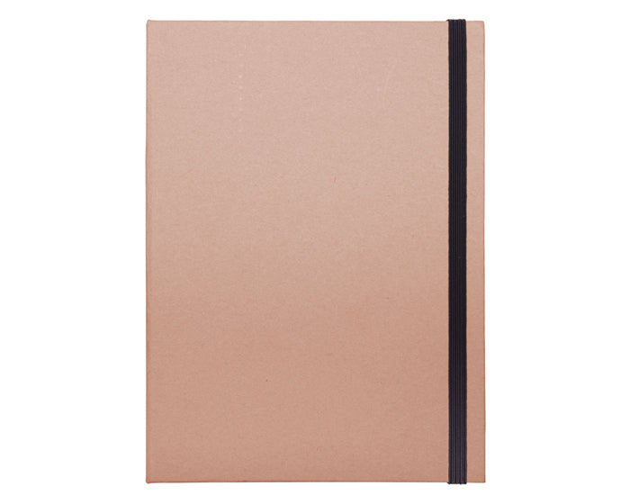 estuche ecológico de cartón con resorte para cerrarse, cuenta con: block de 40 hojas rayadas, regla de 15 cm, bolígrafo de cartón, goma blanca, sacapuntas y 2 lápices.