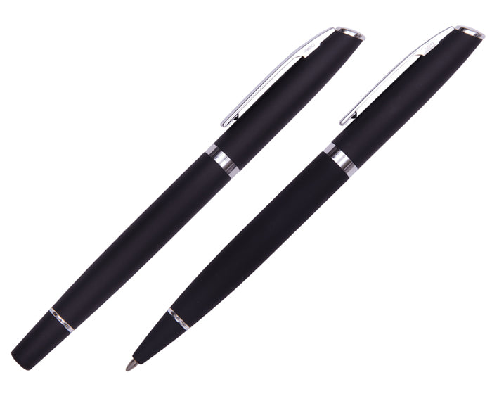 set de bolígrafos metalicos con recubrimiento de goma. incluye bolígrafo tipo roller con tapa y bolígrafo con mecanismo retráctil. detalles y clip metálicos. presentación: caja en color negro.