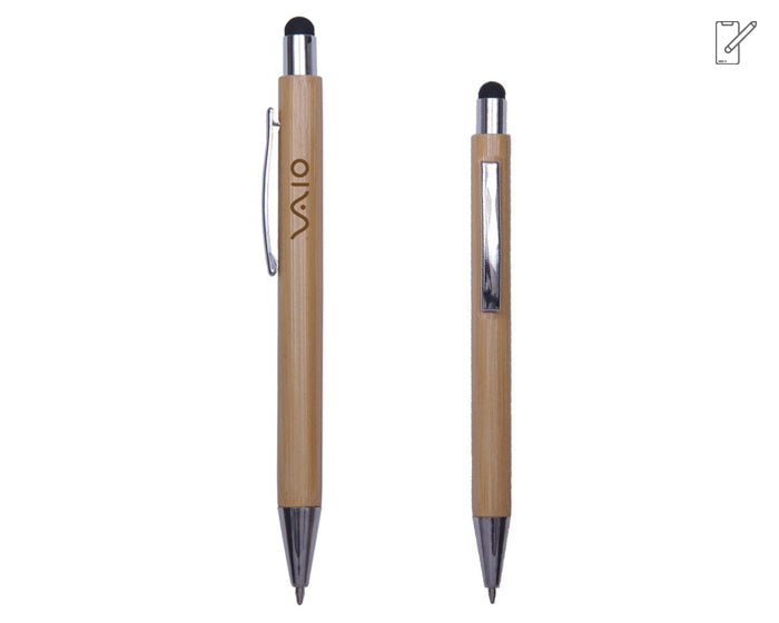 bolígrafo de bambú, clip y punta metálico. con punta touch para pantallas táctiles. mecanismo de click.