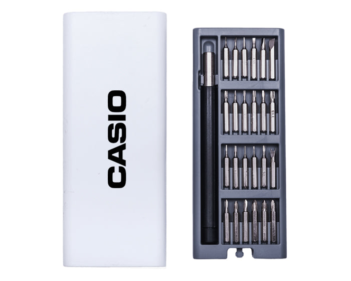 estuche con desarmador de 24 puntas intercambiables. base con imán para acomodo de las piezas. incluye: caja en color blanco.