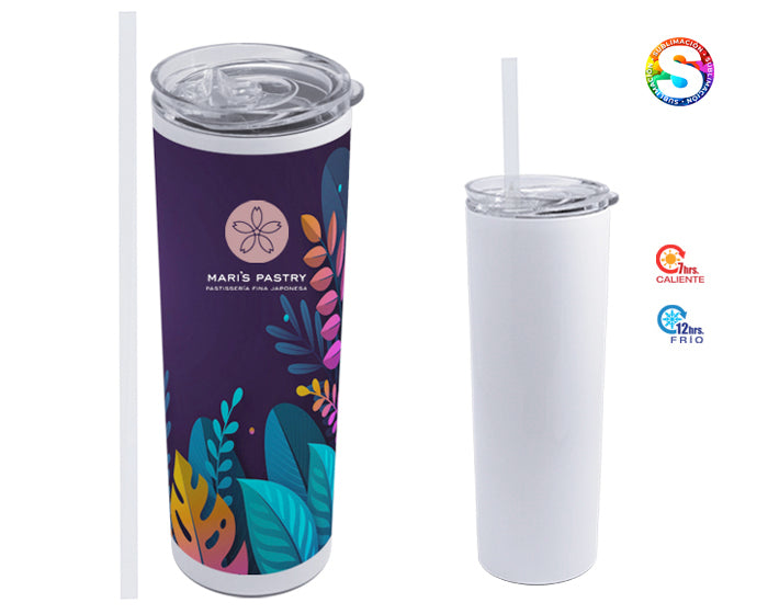 termo para sublimar con doble pared de acero inoxidable insulado al alto vacío, mantiene las bebidas calientes por 7 hrs. y frías por 12 hrs. cuenta con tapa a presión con seguro deslizable y popote de plástico. cap. 600 ml. (20 oz). presentación: caja individual.