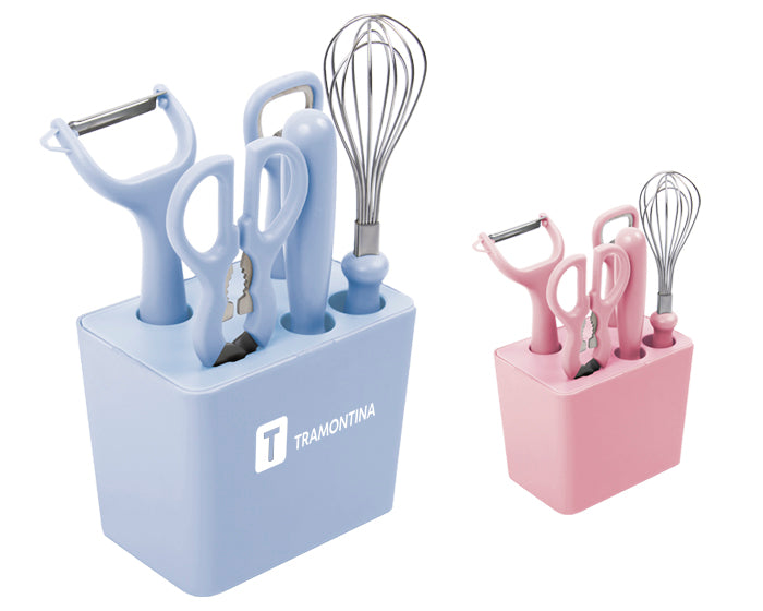 kit de accesorios de cocina que contiene: tijeras, batidor, pelador, destapador y cuchillo. cuenta con una base de soporte. presentación: caja en color blanco.