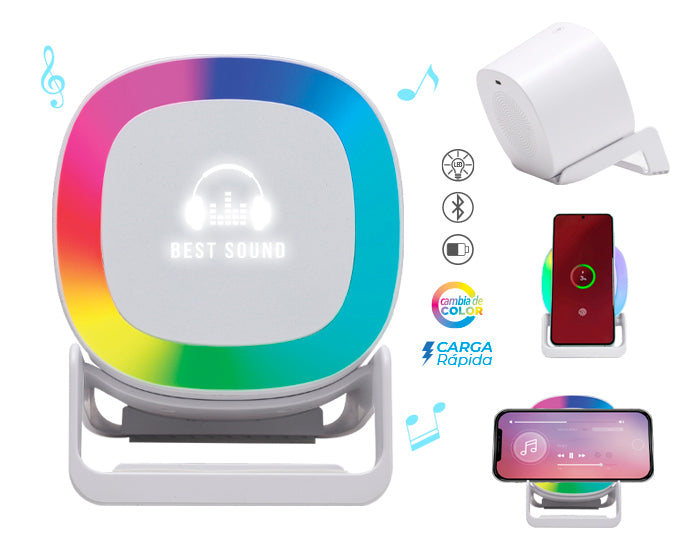 bocina bluetooth portátil de carga rápida qi (15w), cuenta botón touch para encender/apagar y cambiar la modalidad de la luz, luz led multicolor, al grabar en láser en el centro de la bocina, destapa con luz led. cuenta con 2 bases como soporte para colocar el dispositivo móvil de manera vertical y horizontal, puerto de carga entrada tipo c. incluye cable de carga. compatible con dispositivos android e ios. presentación: caja de regalo a color.